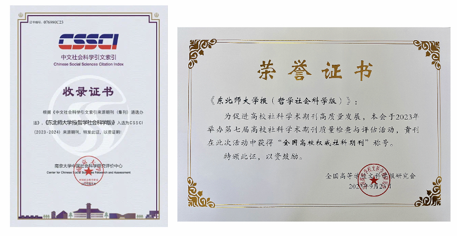 近日,《东北师大学报(哲学社会科学版)》再次入选CSSCI(2023-2024)来源期刊并获评“全国高校权威社科期刊”荣誉称号。 根据南京大学中国社会科学研究评价中心中文社会科学引文索引(CSSCI)数据库最新数据显示,《东北师大学报(哲学社会科学版)》连续入选CSSCI(2023-2024)来源期刊目录。 全国高等学校文科学报研究会2023年9月23至24日在湖北宜昌举行成立35周年庆祝大会暨研究会九届三次理事会会议。会上公...