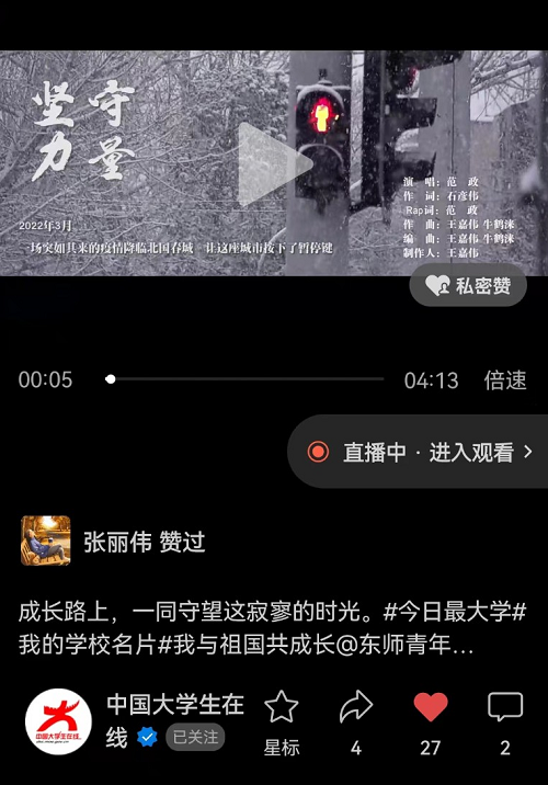由我校音乐学院出品,传媒科学学院2008届毕业生石彦伟作词,传媒科学学院青年教师王嘉伟和音乐学院2018级本科生牛鹤涞共同谱曲、编曲,音乐学院2011届毕业生范政演唱,汇聚毕业生、在校生、青年教师共同制作抗疫歌曲《坚守力量》及其MV于近日推出,并被“中国大学生在线”视频号、央广网客户端、央视新闻移动客户端、学习强国等多家媒体转载。