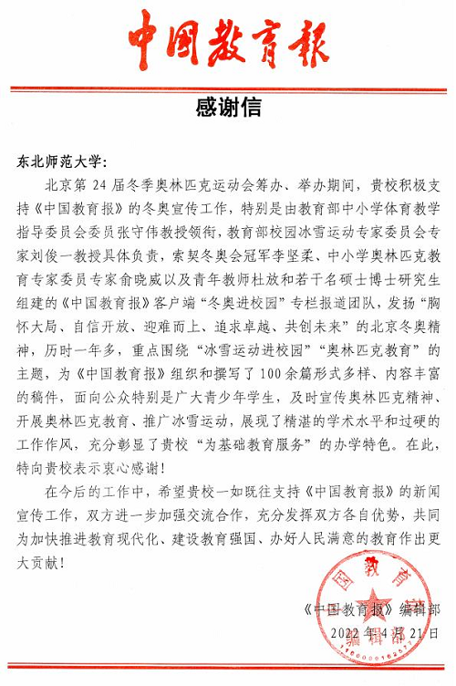 近日,我校收到了《中国教育报》编辑部的一封感谢信。来信对我校“冬奥进校园”专栏报道团队在北京冬奥会筹办和举办期间,发扬北京冬奥精神,积极支持《中国教育报》冬奥宣传工作,在及时宣传报道奥林匹克精神、开展奥林匹克就教育、推广冰雪运动等方面,展现出精湛的学术水平和过硬的工作作风,表示衷心的感谢。信中希望今后进一步加强交流合作,共同为加快推进教育现代化、建设教育强国、办好人民满意的教育作出更大贡献。202...