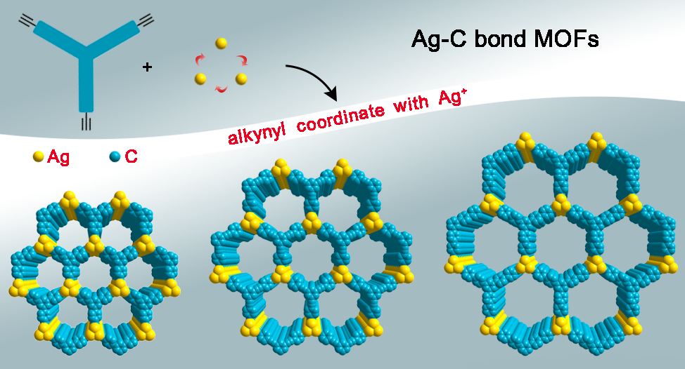 引入新的配位键和开发新结构的通用方法一直是金属有机框架(MOFs)研究的热点之一。较低的可逆性使得利用金属-碳(M–C)键构建结晶有序MOFs成为一项巨大的挑战。团队成员首次报道了三种由银-碳(Ag–C)键连接的等网状微晶MOF材料,并将其命名为AgC-MOF。它们的结构包含Ag(I)和炔基之间的双配位模式(σ和π)。三种AgC-MOFs都表现出三维框架,并具有均匀的一维六边形通道,孔径可以在1.1至1.8 nm之间调节。强共价性的Ag–C键给AgC-MOF带来导电性和半导体性能。AgC-MOF-1的电导率比许多通过传统配位键(M–N和M–O)传输电荷的MOFs高2-4个数量级。AgC-MOFs也显示出半导体特性,并显示出2.52-2.55eV的光学带隙。相关研究成果发表在顶级化学期刊J. Am. Chem. Soc.上,题目为 “Constructing Isoreticular Metal–Organic Frameworks by Silver–Carbon Bonds” ;第一作者为姜丽,通讯作者为贾江涛与朱广山教授。
