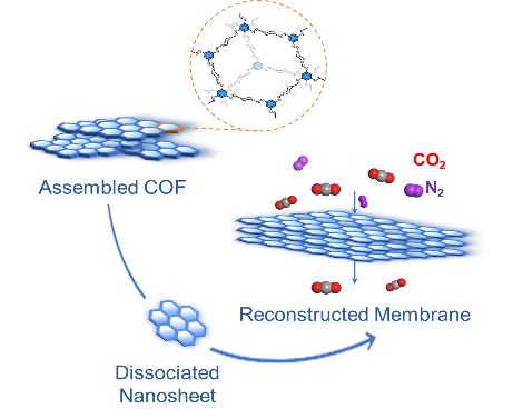 图3. COF膜的组装-解离-重构过程及其CO2/N2分离示意图