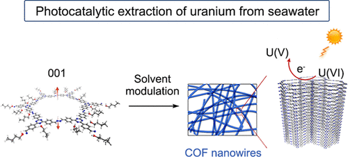 在推动到2050年实现净零排放的过程中,核能将与可再生风能和太阳能一起发挥重要作用,全球对这项成熟技术的兴趣和投资也在相应的加速。海水中的铀可以支持几个世纪的核能发电,但用传统的吸附分离策略从这种巨大的资源中选择性提取铀的效果并不理想。团队报道了通过溶剂调制方法合成三嗪连接的二维共价有机框架的纳米线,该方法可用于获得50至200 nm的纳米线。其中,100nm的纳米线在通过光催化还原捕获铀(VI)方面非常有前景。在模拟阳光下,不使用牺牲剂,纳米线从100ppm的铀酰(VI)溶液中吸收了10.9g/g的铀,这是迄今为止在光催化和电催化铀捕获研究材料中报告的最高值。值得注意的是,这些纳米线在辐照海水42天后仍显示出34.5mg/g的铀吸附能力,这是迄今为止所有铀捕获材料报告的记录。相关研究成果发表在顶级化学期刊J. Am. Chem. Soc.上,题目为“Photocatalytic extraction of uranium from seawater using covalent organ-ic framework nanowires”;第一作者为马旭娇,通讯作者为元野、Jeffrey R. Long与朱广山教授。