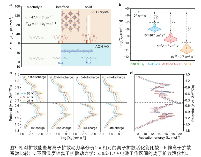 安全、长寿命、超快速充电电池是电动汽车和便携式电子设备等应用的关键组件。近年来,水系锌离子电池因其高能量密度、低成本、非易燃性和高安全性而备受关注。水系锌离子电池的充放电过程与正极材料的离子扩散、电解液离子传输、锌负极表面反应等过程相关。对于传统的晶态正极材料,由于锌离子与晶格势场有较强的库伦相互作用,使其在固体活性材料内部扩散的活化能远高于电解液离子传输和负极表面反应的活化能。因此,如何降低锌离子固体扩散活化能,是提升锌离子电池快速充电能力的关键所在,也是制约本领域发展的科学难题。