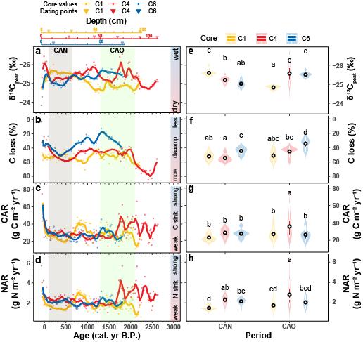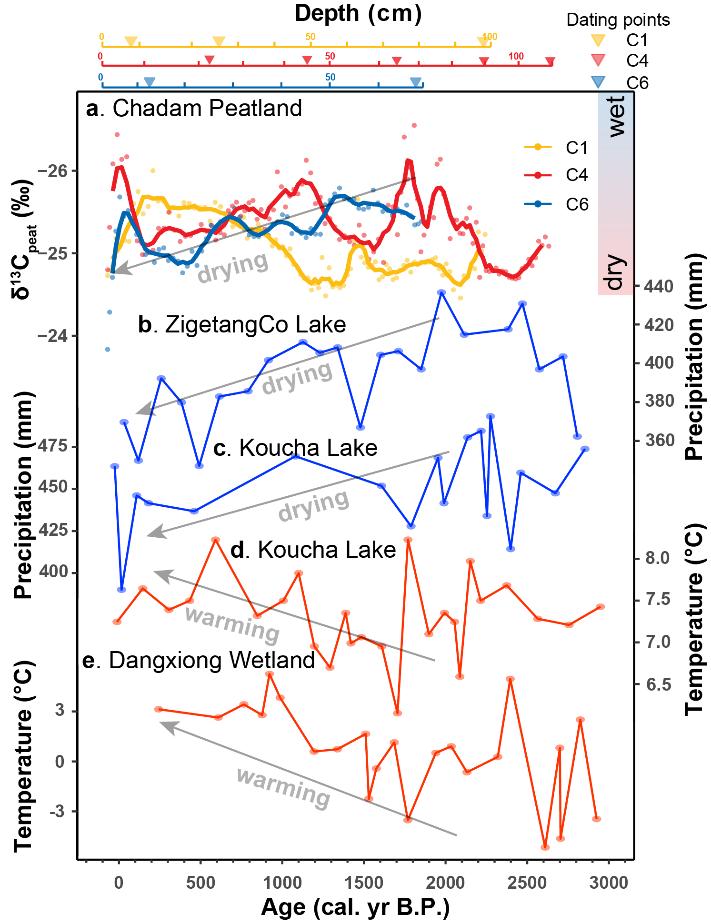 近日,我校地理科学学院Zicheng Yu教授研究团队在青藏高原泥炭地长期碳氮累积动态及调控机制方面取得重要进展。该团队利用三江源地区泥炭地的多根泥炭柱芯,运用古生态学分析手段,揭示了长时间尺度气候、地形、水文、植被和扰动等关键生态要素对高寒泥炭地碳氮累积功能变化的调控作用。相关成果以“Impact of climate-induced water-table drawdown on carbon and nitrogen sequestration in a Kobresia-dominated peatland on the central Qinghai-Tibetan Plateau”为题,发表在Nature旗下的Communications Earth & Environment期刊上(2025,vol. 6,188)。