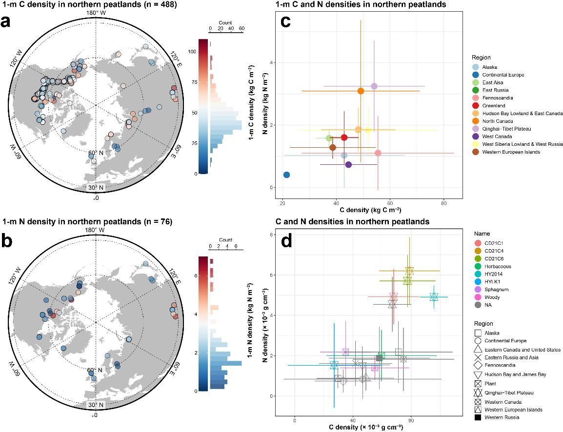 泥炭柱芯记录及数据集成结果表明:近千年来,气候暖干化导致查旦泥炭地水位下降和地表干旱化(图2)。水位加深延长了泥炭在表层富氧层的滞留时间,促进了有机质分解,致使该时期碳氮累积速率显著降低(分别下降约20 kg C m-2 yr-1和2 kg N-2 yr-1)(图3)。这一现象可能在三江源地区具有普遍性。尽管如此,青藏高原仍是北方泥炭地中碳氮密度最高的地区之一(1米深度碳氮密度分别为54.1±18.9 kg C m-2和3.2±1.5 kg N m-2)(图4)。本研究强调了若未来气候持续暖干化可能会威胁青藏高原泥炭地碳氮库及碳氮汇能力的稳定性。