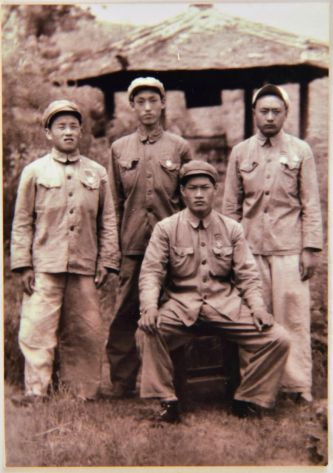 1953年在朝鲜抗美援朝停战协定签订后,白皋(右二)与战友在一个山村合影