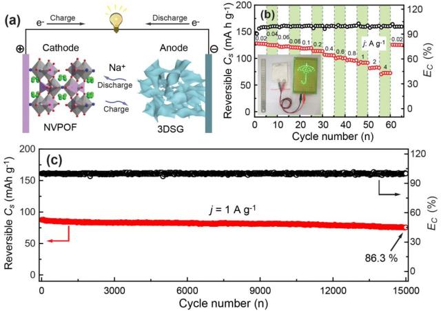 图2钠离子全电池3DSG//Na3V2(PO4)2O2F的示意图及其倍率和超长寿命循环性能