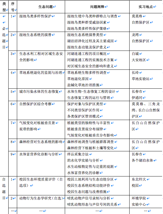 改革后的实习方案中,参考当前生态学研究热点,在吉林省内筛选典型湿地、草地、农田、森林、水域、城市等系统的生态问题,采取必选(9)+自选(X)模式,针对每一个问题,给出不同方向、程度的提示,引导学生进一步深入思考和自主研究。将原有的自吉林省中部至东部长度500公里的实习路线(长春市-三角龙湾自然保护区-长白山自然保护区),延长为纵贯吉林省西北-东南的1000公里的实习路线(莫莫格自然保护区-西部河湖连通工程区-长岭草地实验站-长春市-三角龙湾自然保护区-长白山自然保护区)。