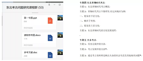 本课程选择“腾讯会议”在线直播,通过实时提问、互动交流等功能,能够较好地满足教学需求;同时利用微信群发布课件、参考书目、作业题目以及各种补充的学习材料(与课程相关的一些视频资料,如《探索发现》《考古中国》等)。
