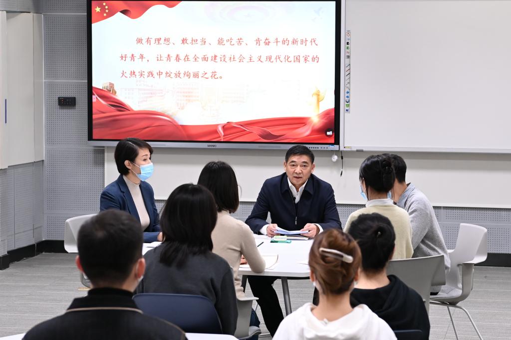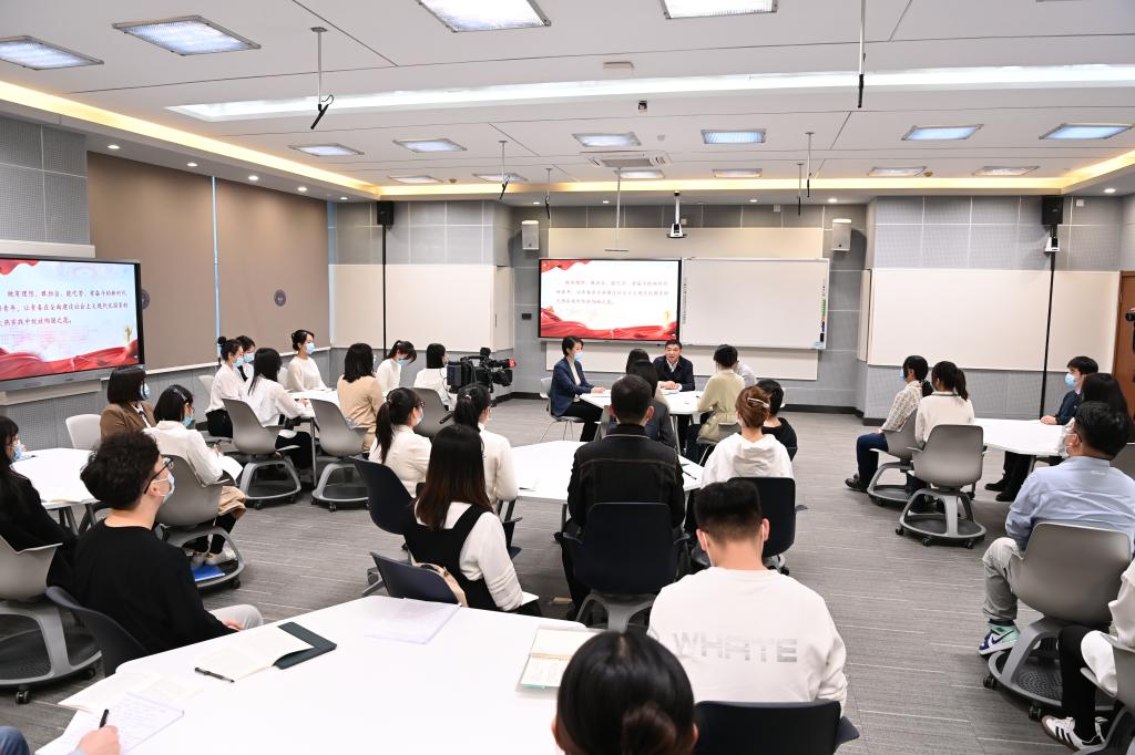 在逸夫教学楼智慧教室,马克思主义学部段妍老师的“思想道德与法治”课堂,围绕深刻学习领会过去5年工作和新时代10年伟大变革、深刻学习领会不断谱写马克思主义中国化时代化新篇章的历史责任等方面,舒启明以思政课形式宣讲党的二十大精神,并与马克思主义学部师生代表互动交流。