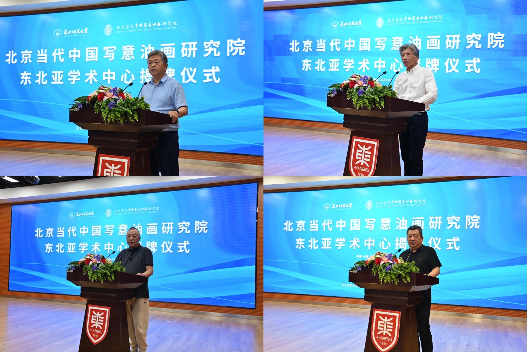 中国美术家协会主席、中央美术学院原院长范迪安,北京当代中国写意油画研究院院长王辉,院学术委员会主任杨参军,校党委书记兰恒斌,校长徐海阳出席会议,来自中国美术家协会、东北地区各省级美术家协会、中央美术学院、中国美术学院、鲁迅美术学院、哈尔滨师范大学、大连艺术学院等社会团体和相关高校的80余名专家学者参加了揭牌仪式。王辉、杨参军、兰恒斌、徐海阳共同为北京当代中国写意油画研究院东北亚学术中心揭牌。徐海阳为中心主任王建国颁发聘书。活动由副校长魏民主持。
