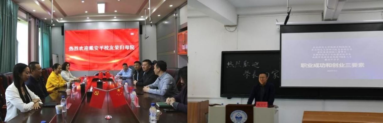 回访期间,戴安平校友在物理学院和有关部门负责人陪同下参观了图书馆、学生就业指导服务中心以及规划建设中的校史馆,了解学校发展及学生就业情况。随后,戴安平与物理学院班子成员深入交流人才培养工作,并为师生做了题为“职业成功及创业三要素”的主题讲座。他结合自身经历和企业发展历程,寄语学子们珍惜校园时光、夯实专业基础、培育正确价值观。