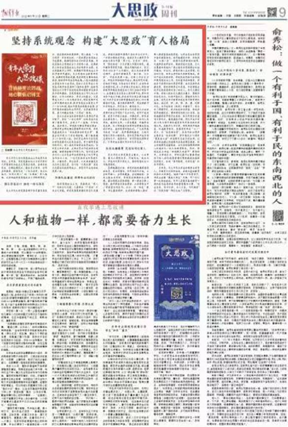 5月10日,《中国青年报》9版大思政专版头题刊发了我校党委书记杨晓慧撰写的题为“坚持系统观念 构建‘大思政’育人格局”的文章。文章从强化顶层设计、加强队伍建设、抓好关键要素三方面,结合此次校园疫情防控工作,阐述了我校探索形成的“一体化领导、专业化运行、协同化育人”的“大思政”育人格局,学校思想政治工作取得实实在在的成效。