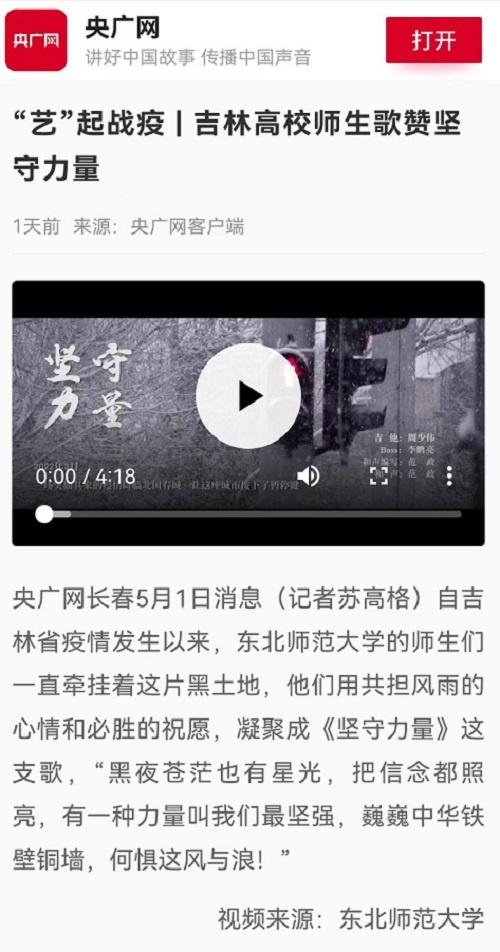 由我校音乐学院出品,传媒科学学院2008届毕业生石彦伟作词,传媒科学学院青年教师王嘉伟和音乐学院2018级本科生牛鹤涞共同谱曲、编曲,音乐学院2011届毕业生范政演唱,汇聚毕业生、在校生、青年教师共同制作抗疫歌曲《坚守力量》及其MV于近日推出,并被“中国大学生在线”视频号、央广网客户端、央视新闻移动客户端、学习强国等多家媒体转载。