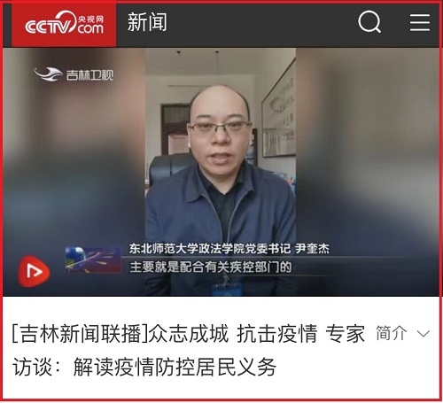 目前,全省上下众志成城、抗击疫情。3月20日、21日,《吉林新闻联播》邀请我校两位教师——坚守校园战“疫”一线的夏华楼学生临时党支部书记、政法学院党委书记尹奎杰教授,9舍学生临时党支部书记、心理学院院长校盖笑松教授,作为访谈专家,解读“疫情防控居民义务”,提出“适度心理疏导 保证身心健康”的相关建议。