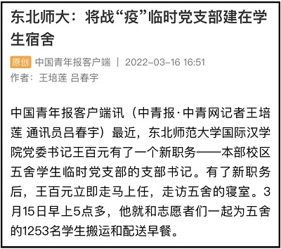 报道中指出,为了开展好疫情防控工作,从3月15日开始在校园内实行静态管理政策,学校党委决定在每个宿舍楼成立“学生宿舍临时党支部”,每个楼层还成立1个临时党小组,着力解决静态管理给学生带来的不便。临时党支部书记由已住进校内的学院(部)党委书记或者院长担任,学院(部)骨干辅导员担任副书记,党小组成员由学生党员、干部组成,同时担任学生志愿者。